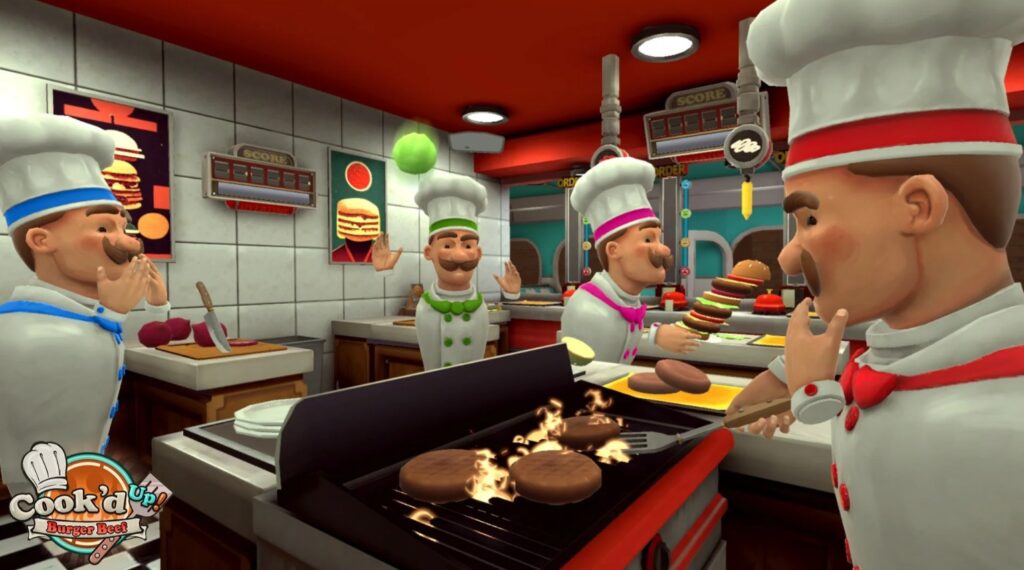 A family-friendly team-building game. Enter a virtual kitchen where you and your fellow chefs face the challenge of tons of hungry customers. Assign tasks, work together, and flip as many burgers as you physically can. As you and your chefs progress, the recipes will get more complicated, and intensive teamwork is required to keep the customers satisfied.